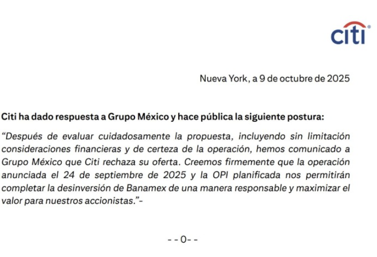 México .- Citi anunció este 9 de octubre de 2025 que rechazó la oferta de Grupo México para adquirir Banamex, tras evaluar la propuesta financiera y los términos de la operación.
