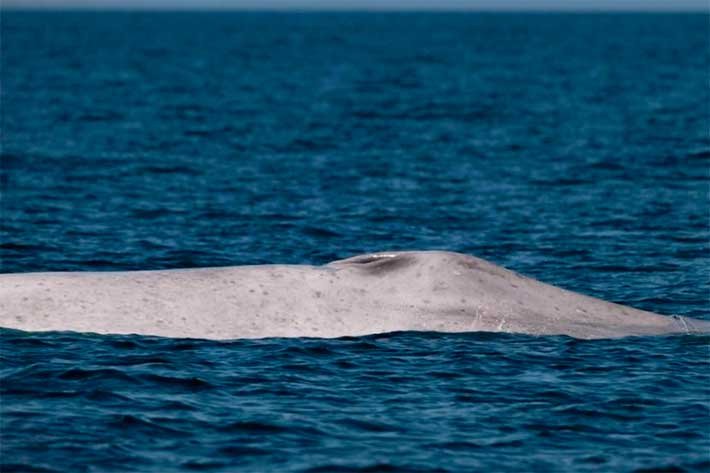 México .- Una ballena azul con albinismo fue avistada en aguas del Parque Nacional Bahía de Loreto, en Baja California Sur.