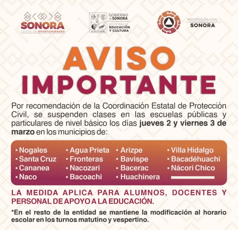 La SEC precisó que la medida aplicará el jueves 2 y viernes 3 de marzo para las escuelas públicas y particulares de nivel básico en Nogales, Santa Cruz, Cananea, Naco, Agua Prieta, Fronteras, Nacozari, Bacoachi, Arizpe, Bavispe, Bacerac, Huachinera, Villa Hidalgo, Bacadéhuachi y Nácori Chico.